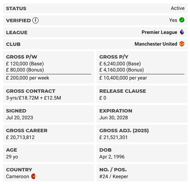 专门披露球员薪资的机构capology显示,奥纳纳在曼联上赛季基础总薪资约为620万镑,未算奖金,相当于周薪12万镑,这一数字被标记为“已证实”。