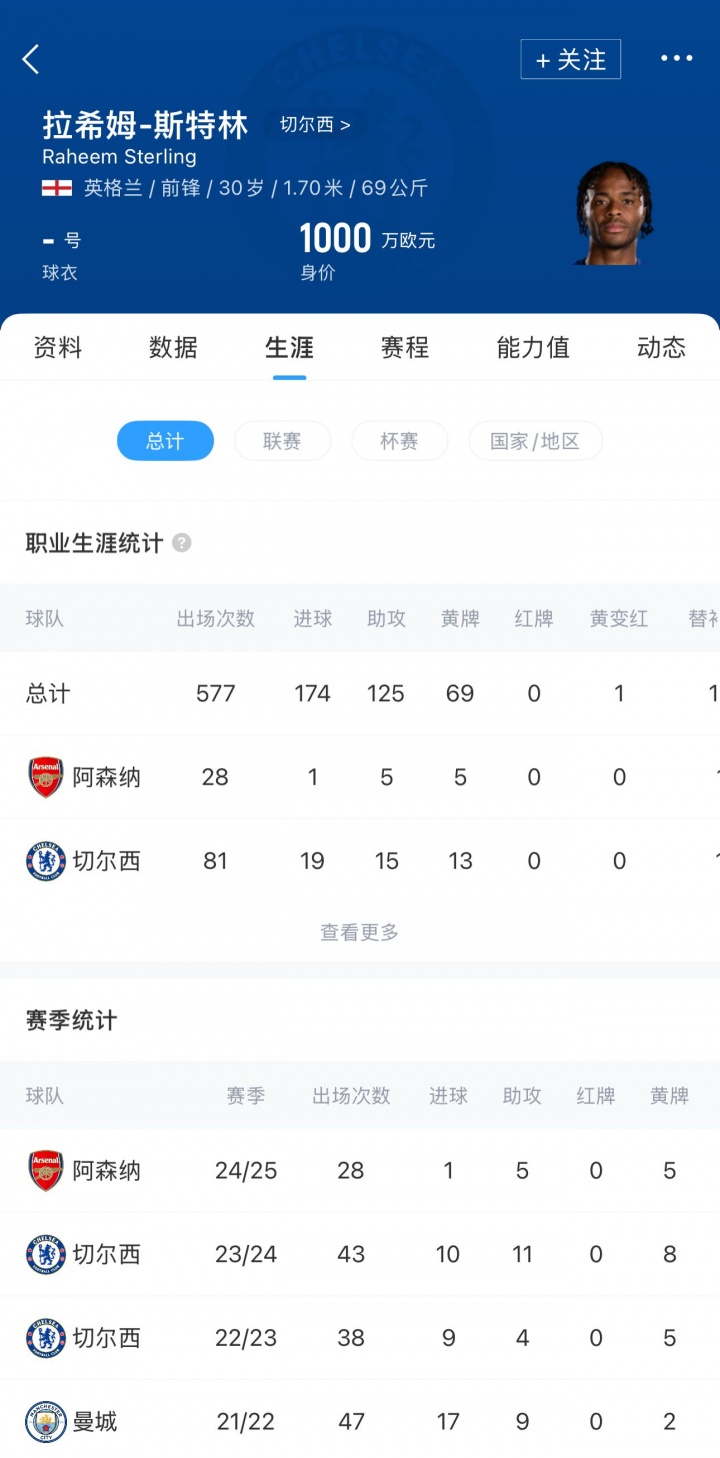 斯特林在2022年与切尔西签署了5年合同,据英媒BBC报道,球员周薪32.5万镑,剩余2年合同价值3000万镑。