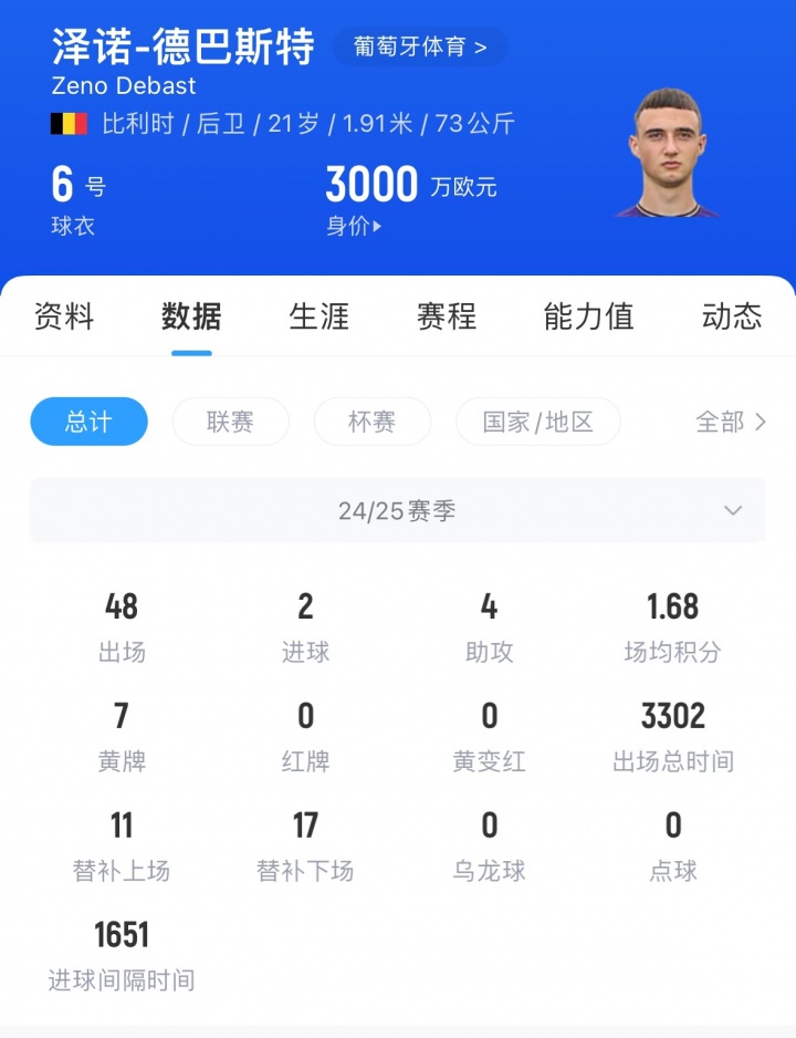 德巴斯特现年21岁,上赛季他为葡体出场48次,贡献2球4助,现身价3000万欧。