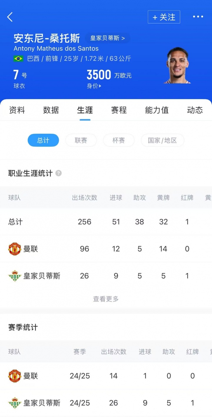 报道称,安东尼与贝蒂斯签订了一份五年合约,其解约金初始金额为5000万欧元,根据合约期内激活解约金的具体时间不同,金额最高可升至6000万欧元。