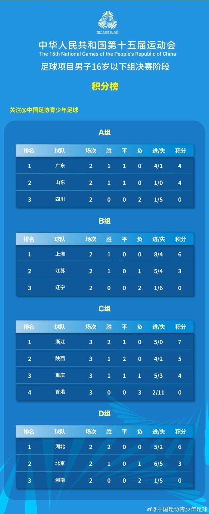 全运会足球项目男子16岁以下组决赛阶段第三比赛日赛果和积分榜