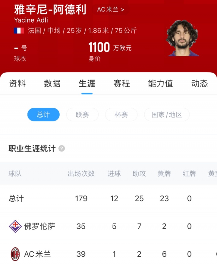 阿德利现年25岁,法国中场。上赛季,他被米兰外租至佛罗伦萨,出场44次取得6球8助。目前其德转身价为1100万欧。