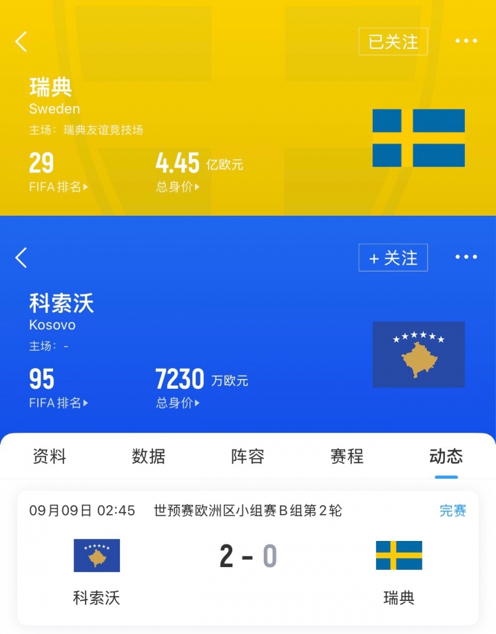 世预赛欧洲区小组赛B组第2轮,科索沃2-0爆冷击败瑞典,拿到3分排名小组第二。