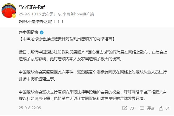 对此,马宁转发了足协的声明并为此配文:“网络不是法外之地!!!”