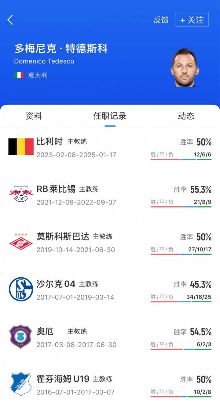 39岁前比利时队主帅特德斯科,此前曾执教沙尔克04、莫斯科斯巴达、RB莱比锡等球队,他的上一份工作是2023年2月至2025年1月执教比利时国家队,取得12胜6平6负后下课。特德斯科将接替此前下课的穆里尼奥。