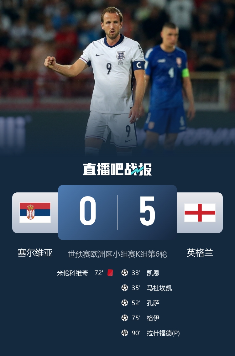 9月10日讯 北京时间9月10日凌晨2时45分,世预赛欧洲区小组赛K组第6轮,英格兰做客红星体育场对阵塞尔维亚。上半场,凯恩首开纪录,马杜埃凯扩大领先优势。英格兰半场2-0领先塞尔维亚。下半场,孔萨破门,米伦科维奇染红,随后格伊打进一球,拉什福德点射破门。最终英格兰5-0大胜塞尔维亚,继续以全胜战绩在小组中领跑。