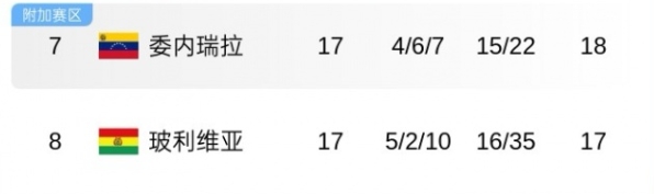 委内瑞拉一度1-0、2-1手握好局,最终被哥伦比亚打崩,3-6主场落败,无缘世界杯附加赛。