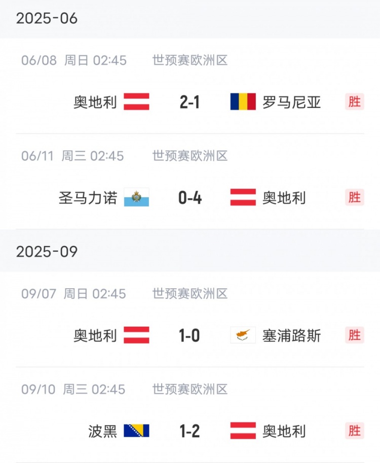 值得一提的是,奥地利在世预赛四战全胜狂揽12分,进9球仅丢2球,战胜同组所有对手,目前少赛一场暂时排名H组第二。
