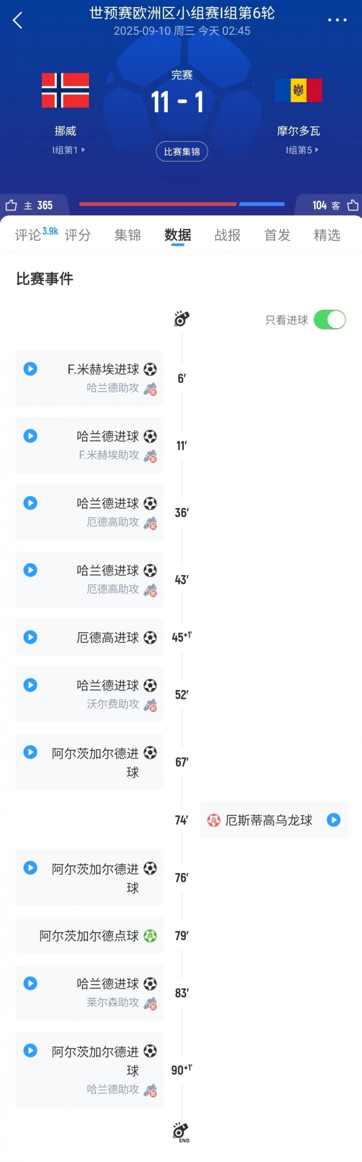 09月10日讯 世预赛欧洲区I组,挪威11-1狂胜摩尔多瓦,挪威球员包办12粒进球,其中包含了一粒乌龙球。