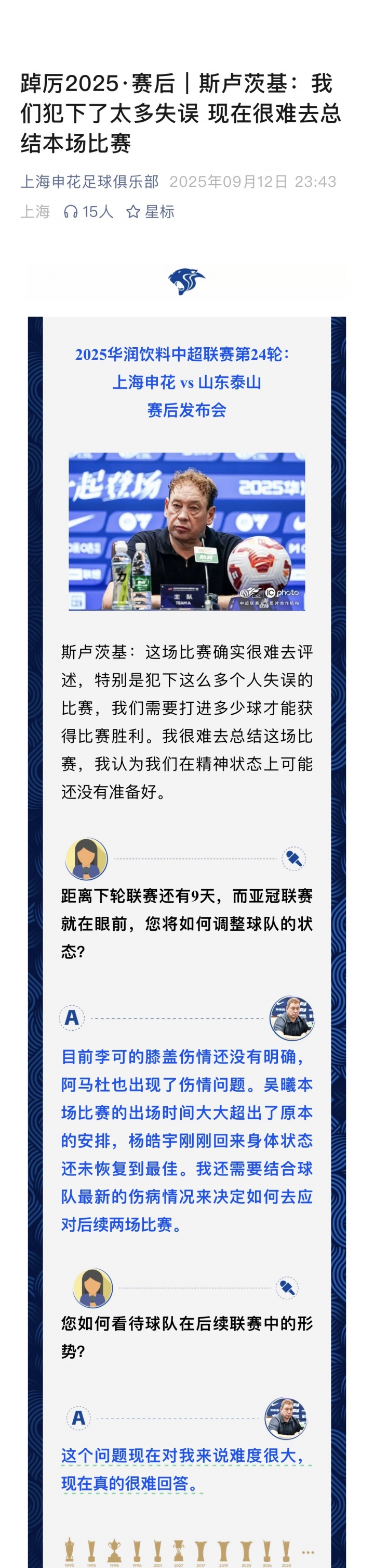 上海申花3-3被山东泰山逼平后,斯卢茨基赛后语出惊人,直言“想死的心都有了”,不过这番话并没有得到上海申花官方社媒的“采纳”。