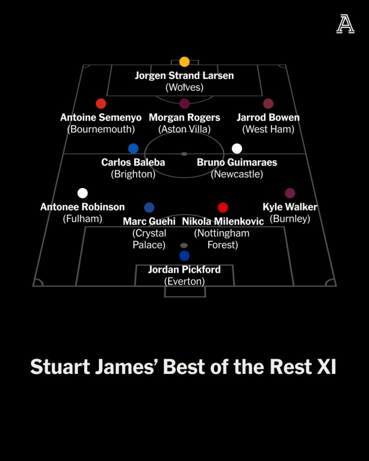 Stuart James: 皮克福德(埃弗顿);格伊(水晶宫)、米伦科维奇(森林)、安东尼-罗宾逊(富勒姆)、沃克(伯恩利);吉马良斯(纽卡)、巴莱巴(布莱顿)、塞梅尼奥(伯恩茅斯)、罗杰斯(维拉)、鲍文(西汉姆);拉尔森(狼队)。