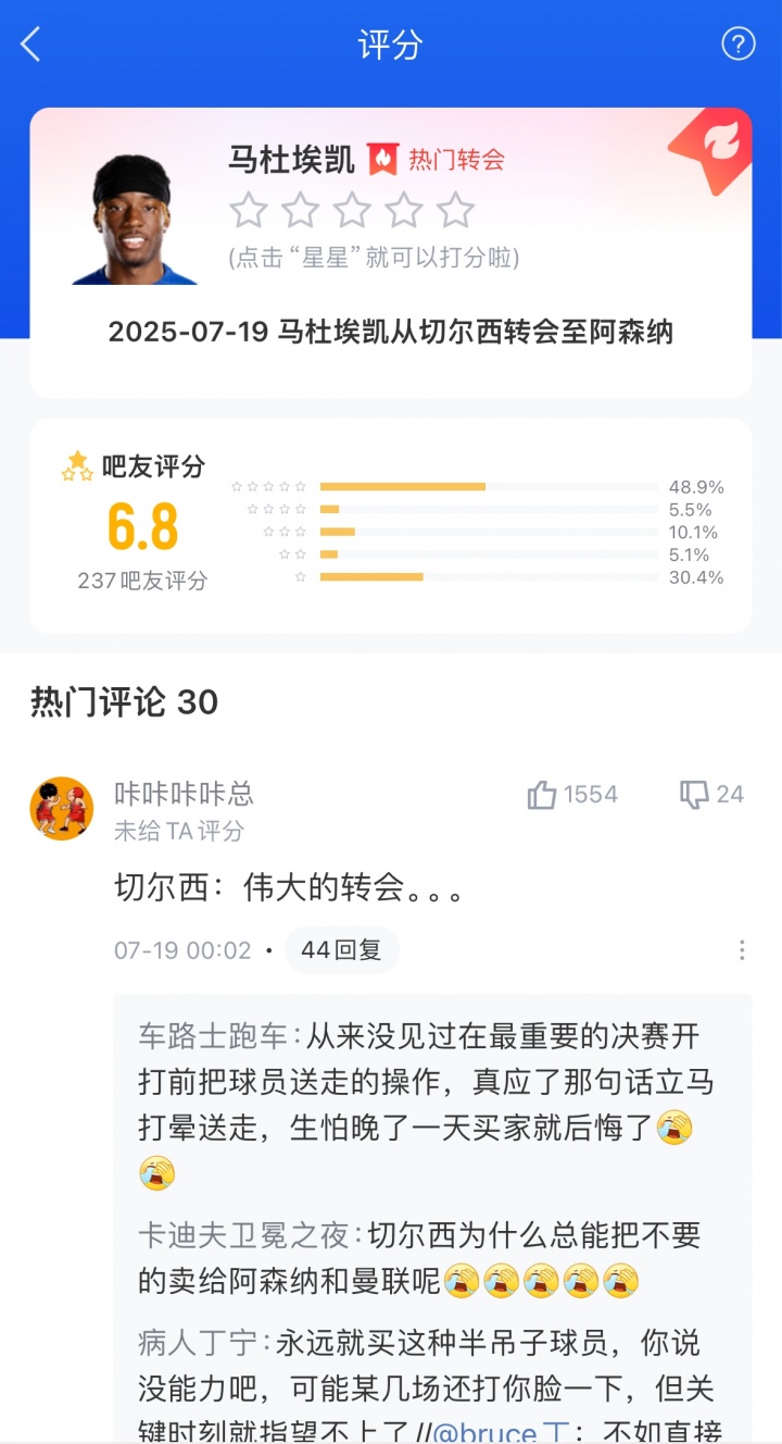 在7月19日阿森纳官宣签下马杜埃凯时,评论区不少质疑声。吧友们仅给马杜埃凯的转会打出6.8的评分,评分呈现两极分化趋势,远低于阿森纳的其他几笔引援交易。