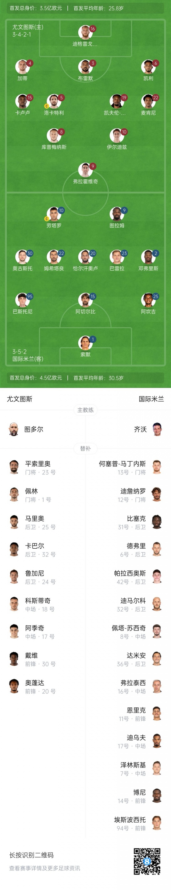 尤文替补:1-佩林、23-平索里奥、17-阿季奇、18-科斯蒂奇、20-奥蓬达、24-鲁加尼、25-若奥-马里奥、30-戴维、32-卡巴尔
