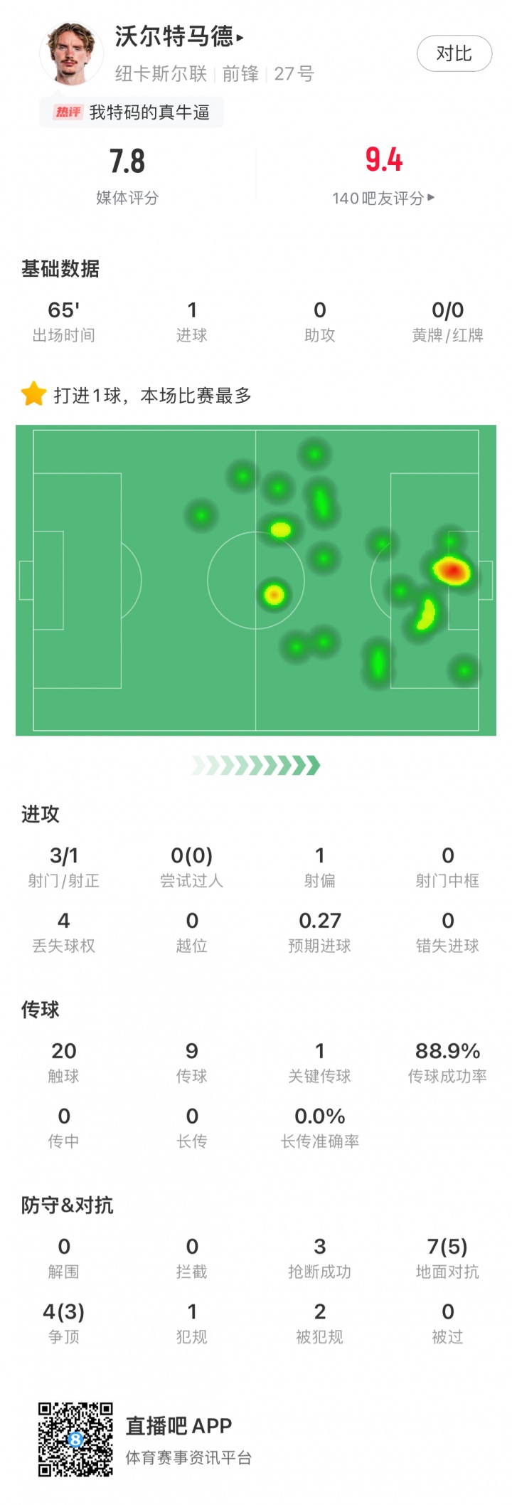 本场比赛,沃尔特马德打入制胜球,争顶四次成功三次,对抗七次成功五次,传球成功率高达88.9%,还贡献了3次抢断。