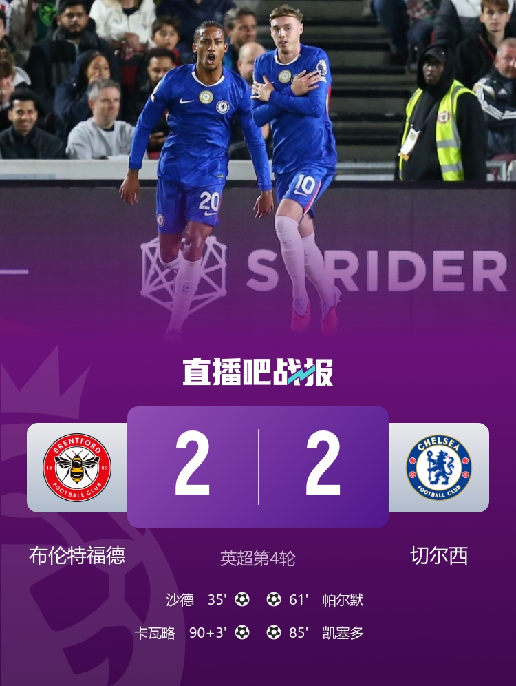 9月14日讯 英超第4轮,布伦特福德坐镇主场布伦特福德社区球场迎战切尔西。上半场,亨德森精彩长传助攻沙德单刀破门。易边再战,帕尔默替补建功后失良机,加纳乔替补首秀,凯塞多绝杀,卡瓦略补时再绝平。最终布伦特福德2-2切尔西。积分榜方面,切尔西8分第五,布伦特福德4分第十三。