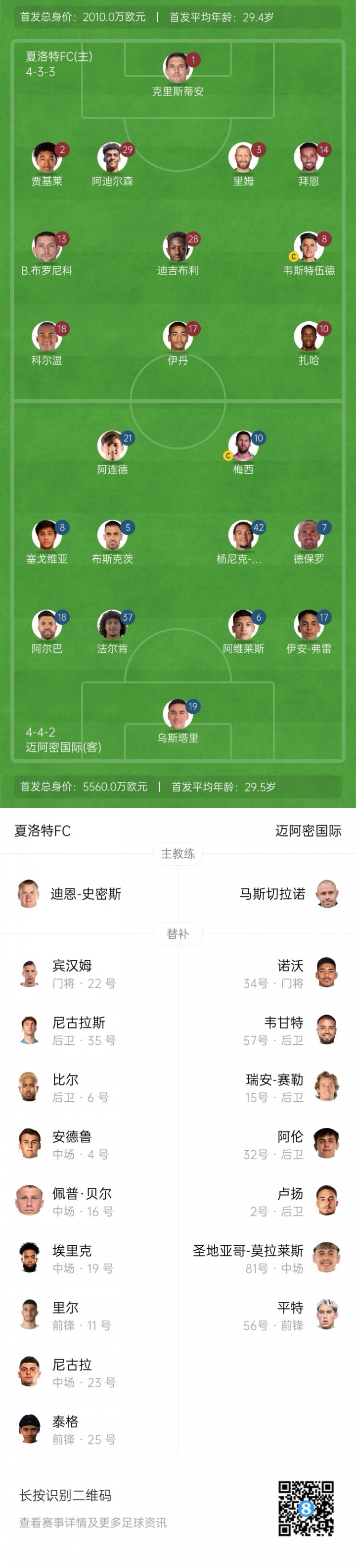 夏洛特FC首发:1-卡利纳、14-拜恩、3-里姆、29-马兰达、2-马绍尔-鲁迪、8-韦斯特伍德、28-迪亚尼、13-布罗尼科、10-扎哈、17-托克洛马蒂、18-科尔温-巴尔加斯