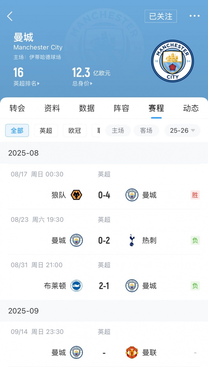 曼城前3轮1胜2负,近两轮连续败给热刺和布莱顿。据统计,这是曼城自2004-05赛季以来首次开赛前3轮遭遇2场败仗,3轮3分也是瓜迪奥拉执教以来前3轮所拿到的最低积分。