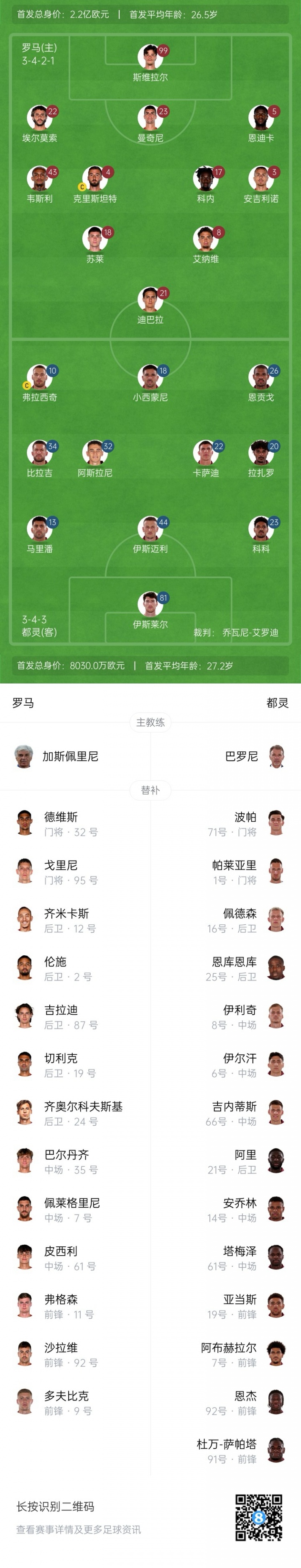罗马首发:99-斯维拉尔、22-埃尔莫索、23-曼奇尼、5-恩迪卡、43-韦斯利、3-安吉利诺、4-克里斯坦特、17-科内、8-艾纳维、18-苏莱、21-迪巴拉