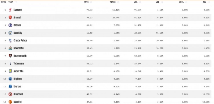 1.利物浦 预期积分79.73分 夺冠概率51.12% 欧冠资格概率91.87% 欧联资格概率3.51% 降级概率0%