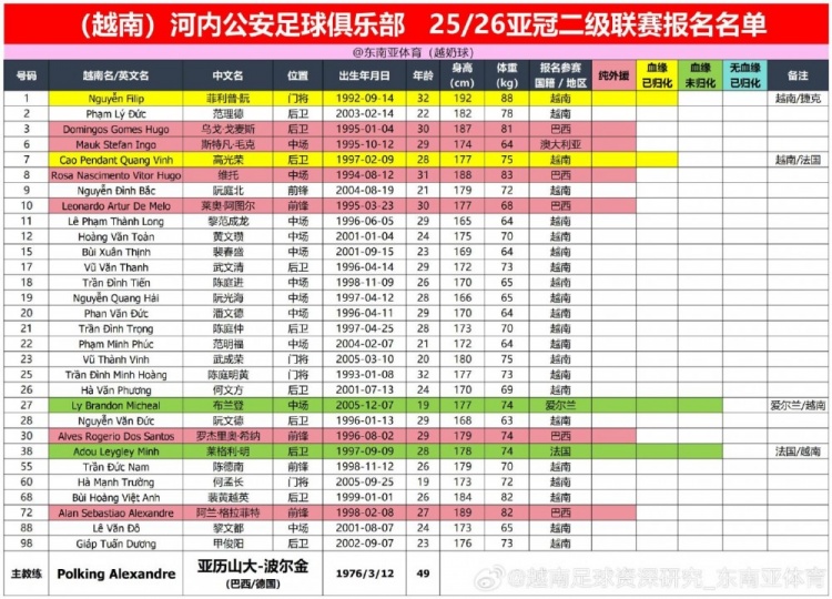 据博主“越南足球资深研究_东南亚体育”在社媒透露,河内公安在本次亚冠二级联赛报名了8名外援(8名外援中有2人是血缘球员,由于未完成归化按外援身份报名),外加两名血缘归化球员。此外,包括菲利普-阮、阮庭北、潘文德、武文清等12名越南国脚或边缘国脚入选。