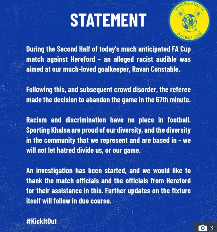 Sporting Khalsa随后也发布了一份声明,称在对阵Hereford的足总杯比赛中,下半场发生了针对其守门员Ravan Constable的种族歧视言论。