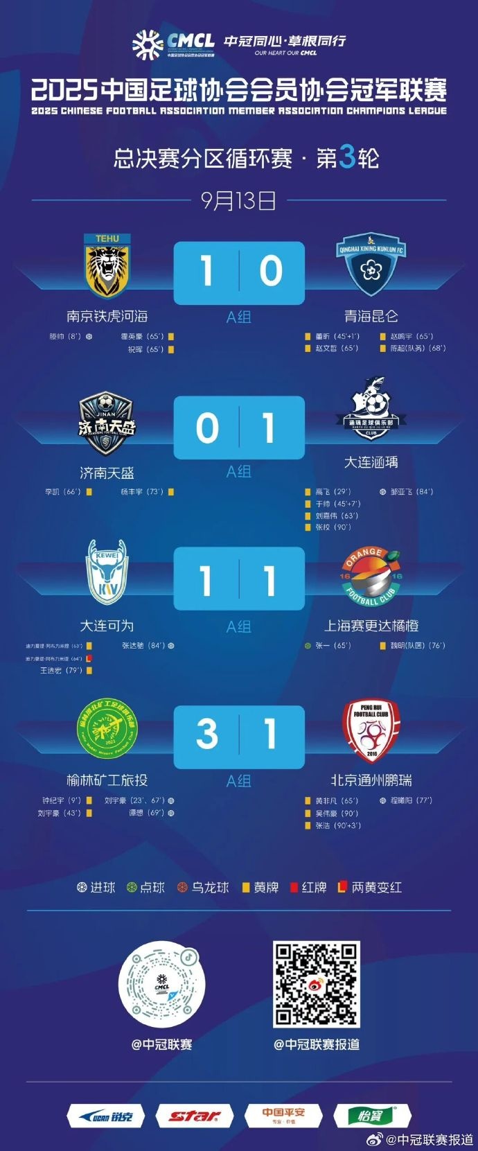 9月15日讯 中冠总决赛分区循环赛第三轮战罢,上海赛更达橘橙以进球数和公平竞赛积分优势领跑A组,厦门壹零贰陆3战全胜领跑B组。