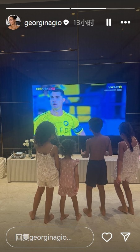 为爸爸加油,乔治娜社媒晒孩子们看c罗比赛的照片