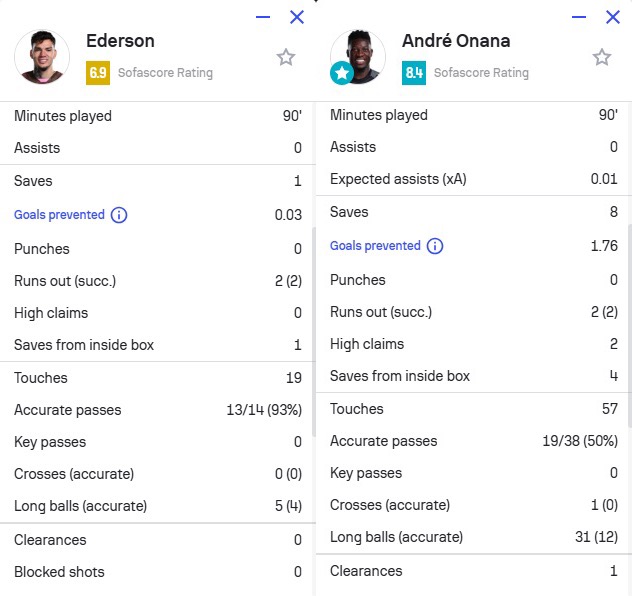 奥纳纳和埃德森本场比赛都称得上成功,前者完全投入和专注,做出了一些聪明的反应和扑救,他没有时间想太多,也没有时间做任何愚蠢的事,可以说是场上最好的球员。