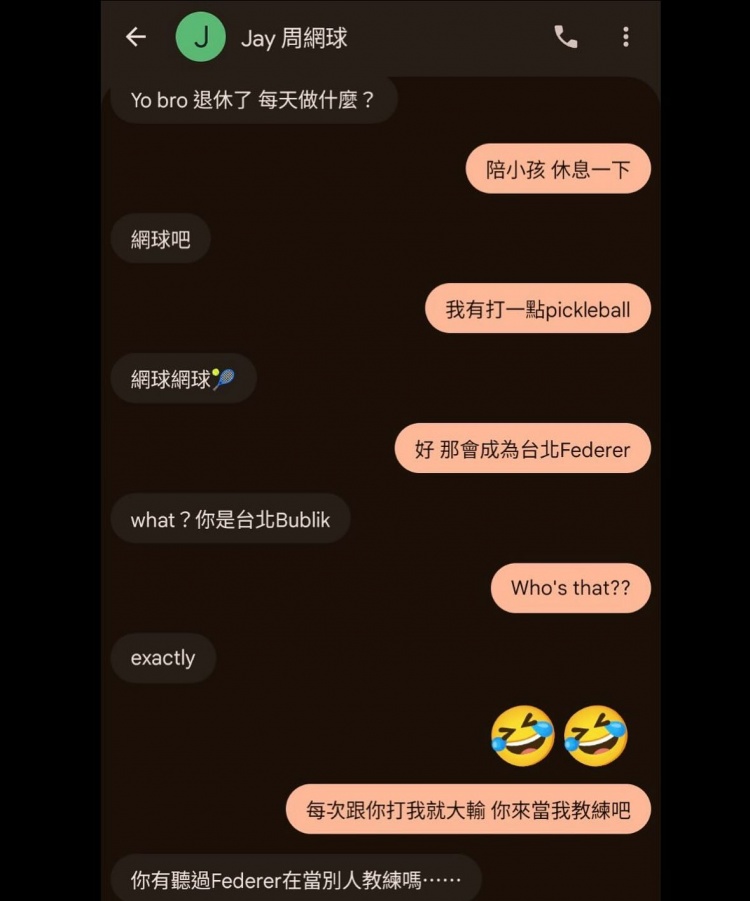 而在聊天截图中可以看到,周杰伦约书豪去打网球,书豪说:“那会成为台北费德勒。”而周杰伦调侃到:“你是台北亚历山大-布勃利克。”书豪还让周杰伦教他打网球,周杰伦表示:“你听过费德勒给别人当教练吗?”