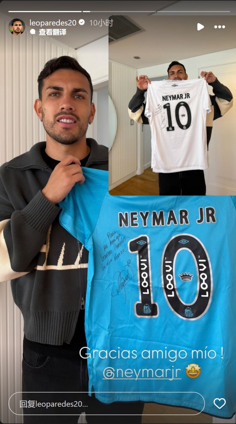 帕雷德斯社媒晒出展示内马尔球衣的照片,配文:“谢谢你,我的朋友。”