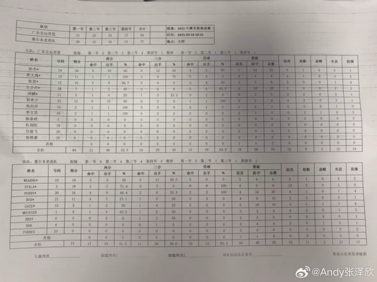 比赛结束后,媒体人@Andy张泽欣 在社媒上晒出了一张本场比赛的数据统计,这是一张离谱的统计表,其中显示,广东男篮58个后场篮板,而表中其它数据又显示墨尔本老虎队今天一共打了43铁(两分16铁,三分25铁,罚球2铁)🤣