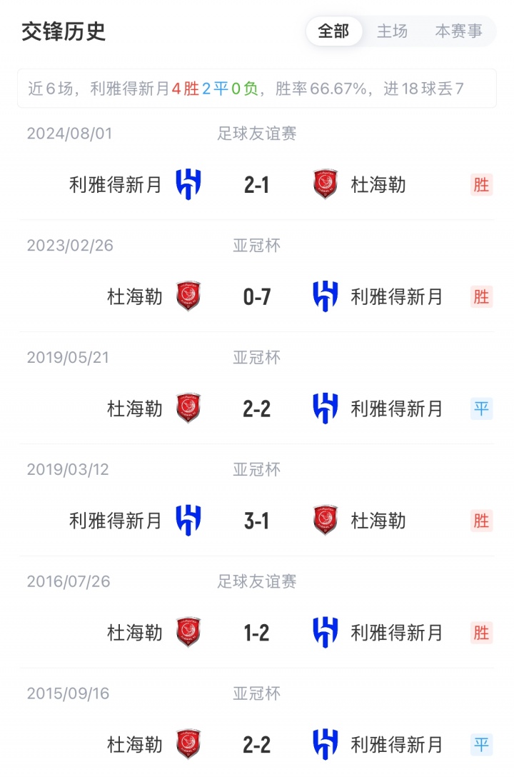新月目前沙特联1胜1平积4分排第5,杜海勒卡塔联1胜1平2负积4分排第7。新月亚冠中对阵杜海勒已6场不败(3胜3平)。