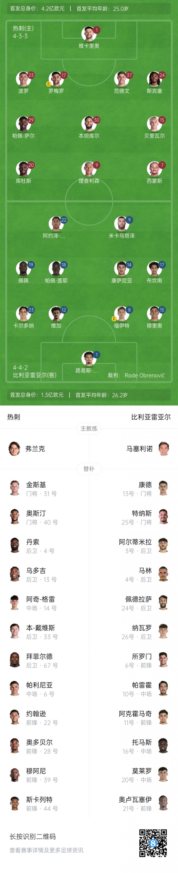 比利亚雷亚尔首发:1-路易斯-儒尼奥尔、8-福伊斯、23-卡多纳、12-维加、15-穆里奥、14-康萨尼亚、18-帕佩-盖耶、17-布坎南、19-尼古拉斯-佩佩、22-阿约泽-佩雷斯、9-米卡乌塔泽