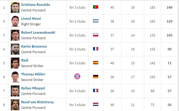 凭借这2粒进球,姆巴佩在欧冠已经打入57粒进球,在欧冠历史射手榜上的排名超过了荷兰传奇前锋范尼(56球),与穆勒并列成为欧冠历史射手榜第6位。
