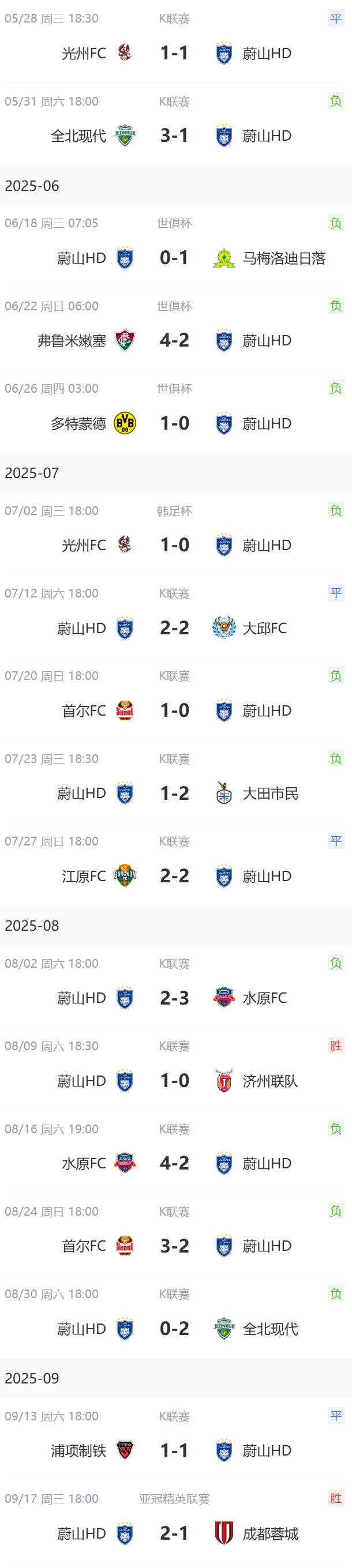 成都蓉城此役告负,送给蔚山HD各赛事近5场首胜,也是他们近17场比赛里的第二场胜利。