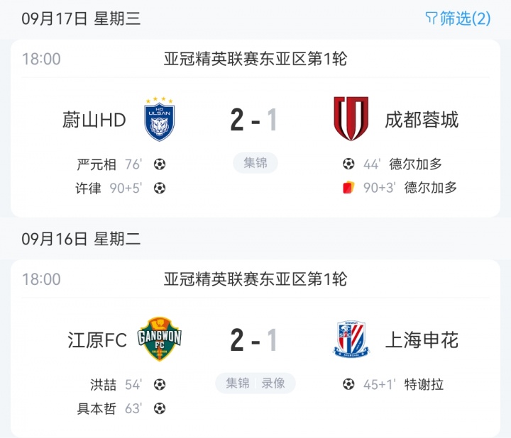 中超头名蓉城1-2蔚山 次名海港半场0-3神户 第三的申花1-2江原