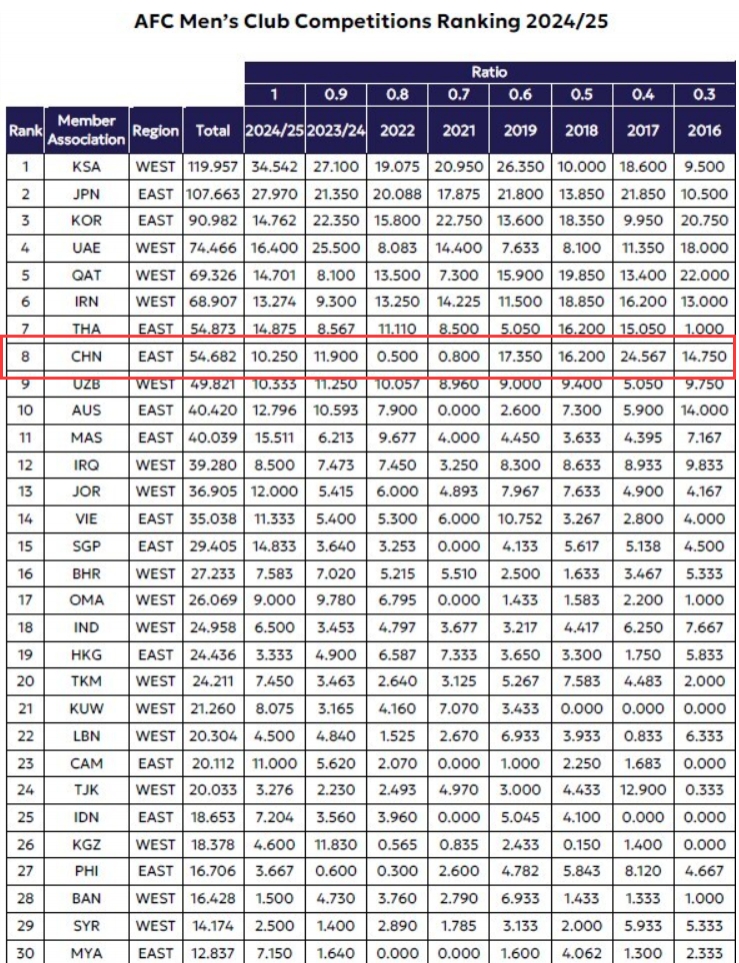 中超1个亚冠精英赛正赛、1个亚冠精英赛附加赛、1个亚冠2。