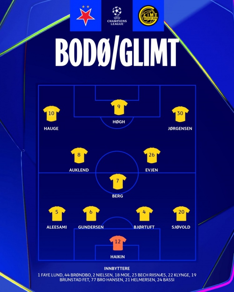 博德闪耀:12-哈伊金;5-阿莱萨米、6-冈德森、4-比约图夫特、20-舍沃尔德、7-博格、8-奥克伦德、26-埃文森、10-海于格、9-霍格、30-马蒂亚斯-约根森