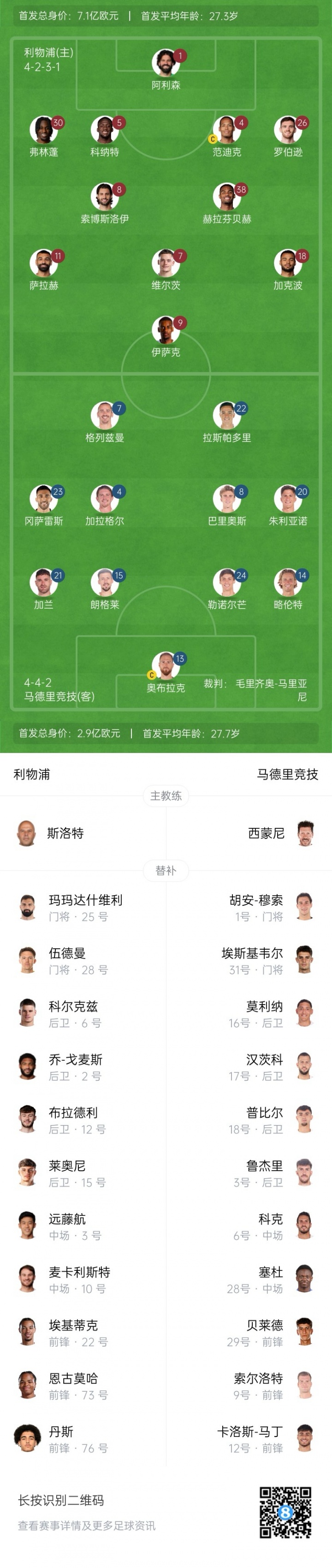 利物浦vs马竞首发:伊萨克首秀PK格子,加克波先发,小蜘蛛伤缺