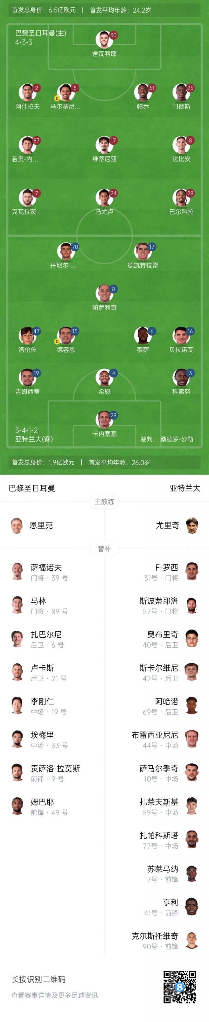巴黎首发:30-舍瓦利耶、2-阿什拉夫、5-马尔基尼奥斯、25-努诺·门德斯、51-帕乔、8-法比安、17-维蒂尼亚、24-马尤卢、87-内维斯、7-克瓦拉茨赫利亚、29-巴尔科拉