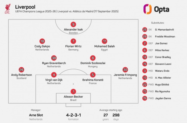 独苗!利物浦VS马竞对阵双方首发11人仅加拉格尔一名英格兰球员