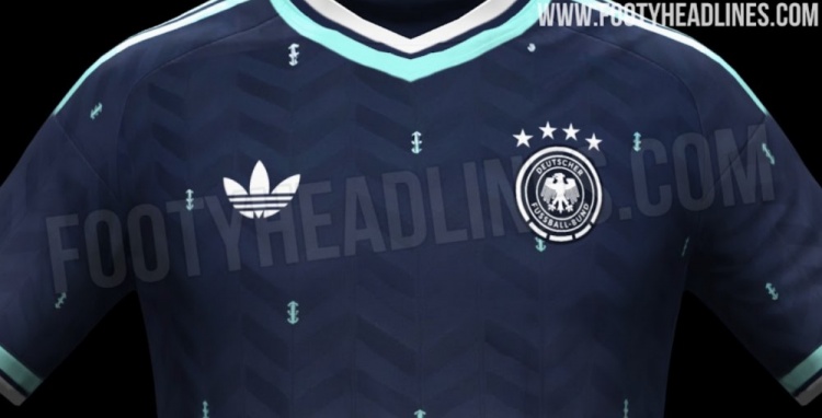 阿迪达斯为德国队设计的2026年世界杯客场球衣将以深海军蓝为主色调,搭配白色标志、薄荷色细节和锯齿状图案。