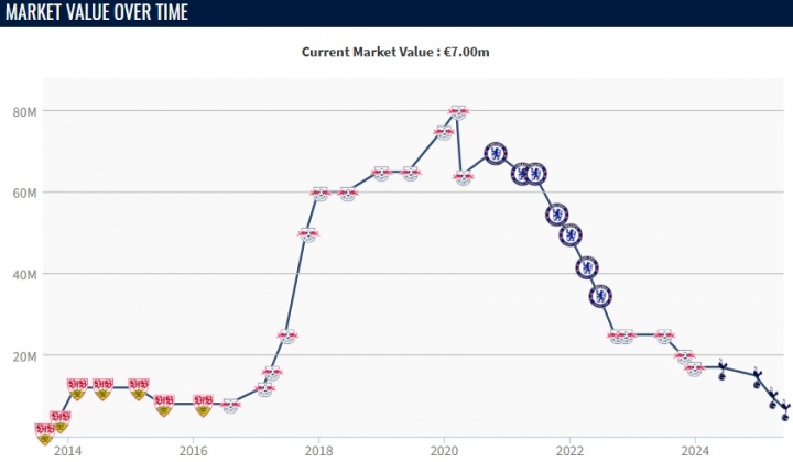 29岁的维尔纳在2020年以5300万欧元转会费加盟切尔西,也是在2020年,球员巅峰身价一度达到8000万欧元,但如今维尔纳身价已经跌至700万欧,他与莱比锡的合同还剩一年到期。