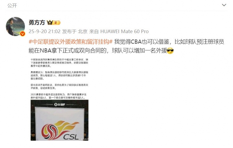 9月20日讯 今天,北京男篮记者@勇方方 在社媒上谈到了中足联提议外援政策和留洋挂钩一事。