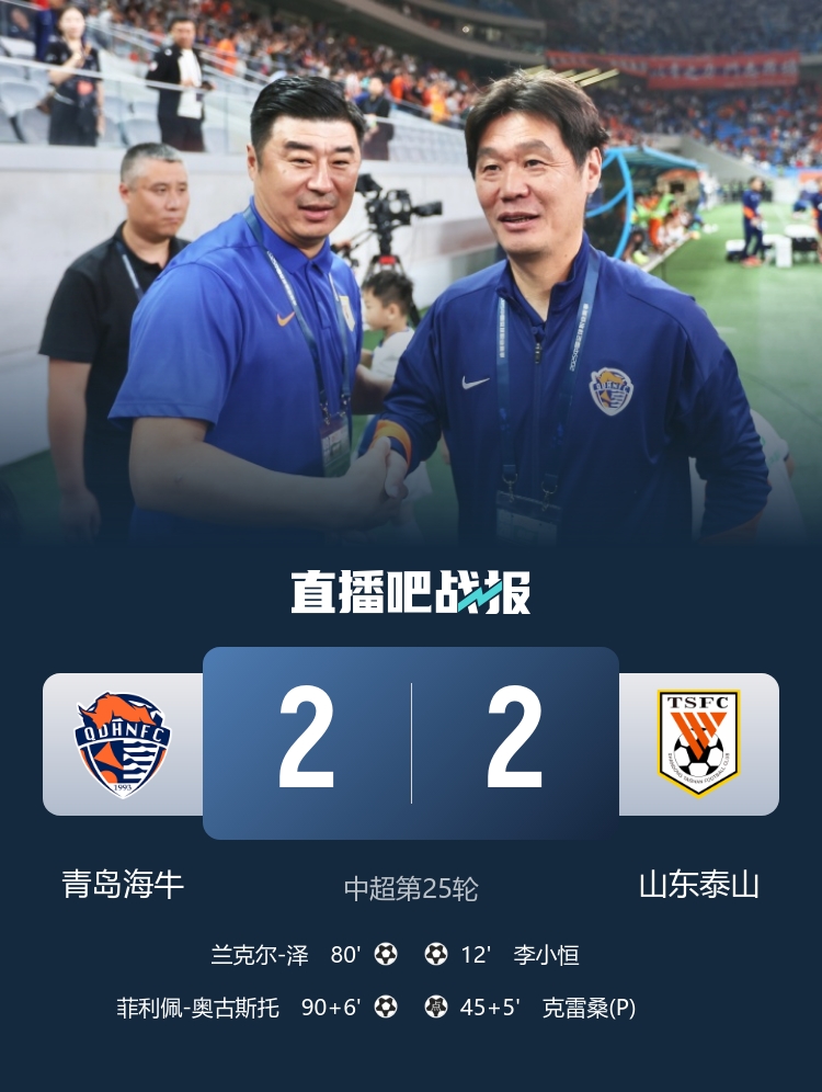 全场比赛结束,山东泰山客场2-2战平青岛海牛。