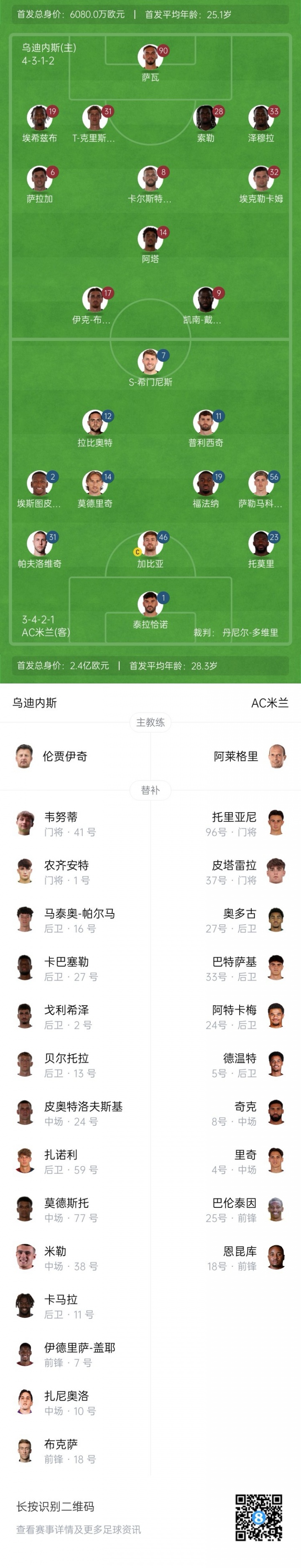 9月21日讯 意甲第4轮,乌迪内斯主场迎战米兰比赛即将打响。赛前首发出炉。