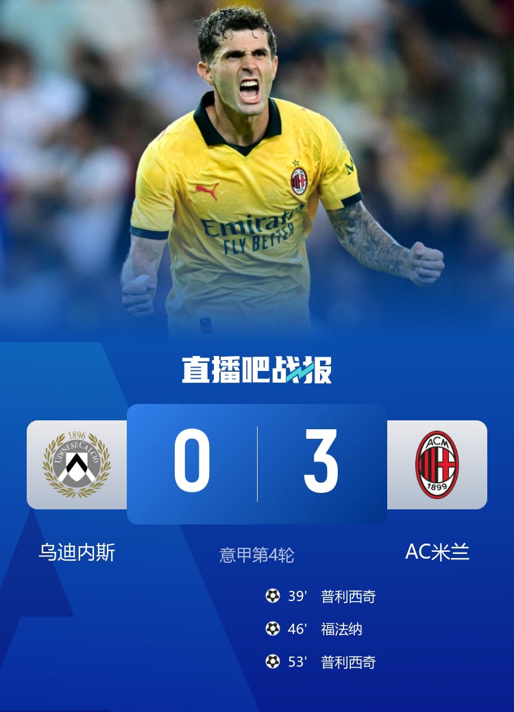 3连胜暂升第3!米兰3-0完胜乌迪内斯 普利西奇2射1传福法纳破门