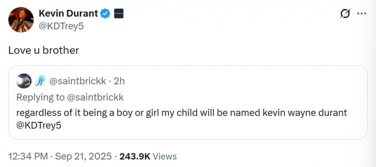 网友:无论是男孩还是女孩,我的孩子都将被命名为凯文-韦恩-杜兰特。