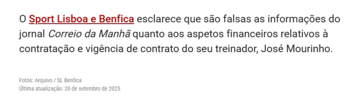 但本菲卡发布声明表示:本菲卡俱乐部澄清,《晨邮报》(Correio da Manhã)中关于教练穆里尼奥的签约及合约有效期相关财务信息均为不实信息。
