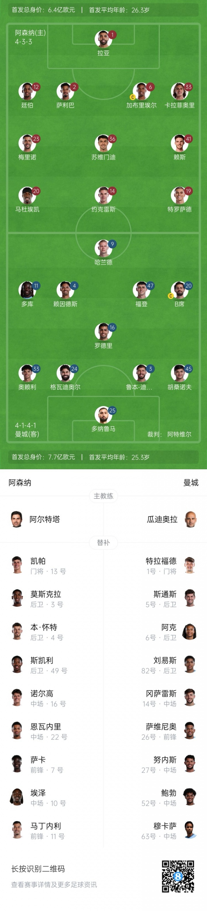 阿森纳替补:13-凯帕、3-莫斯克拉、4-本怀特、7-萨卡、10-埃泽、11-马丁内利、16-诺尔高、22-恩瓦内里、49-斯凯利